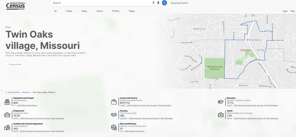 More detailed demographic information for the City of Twin Oaks is available on the U.S. Census website.