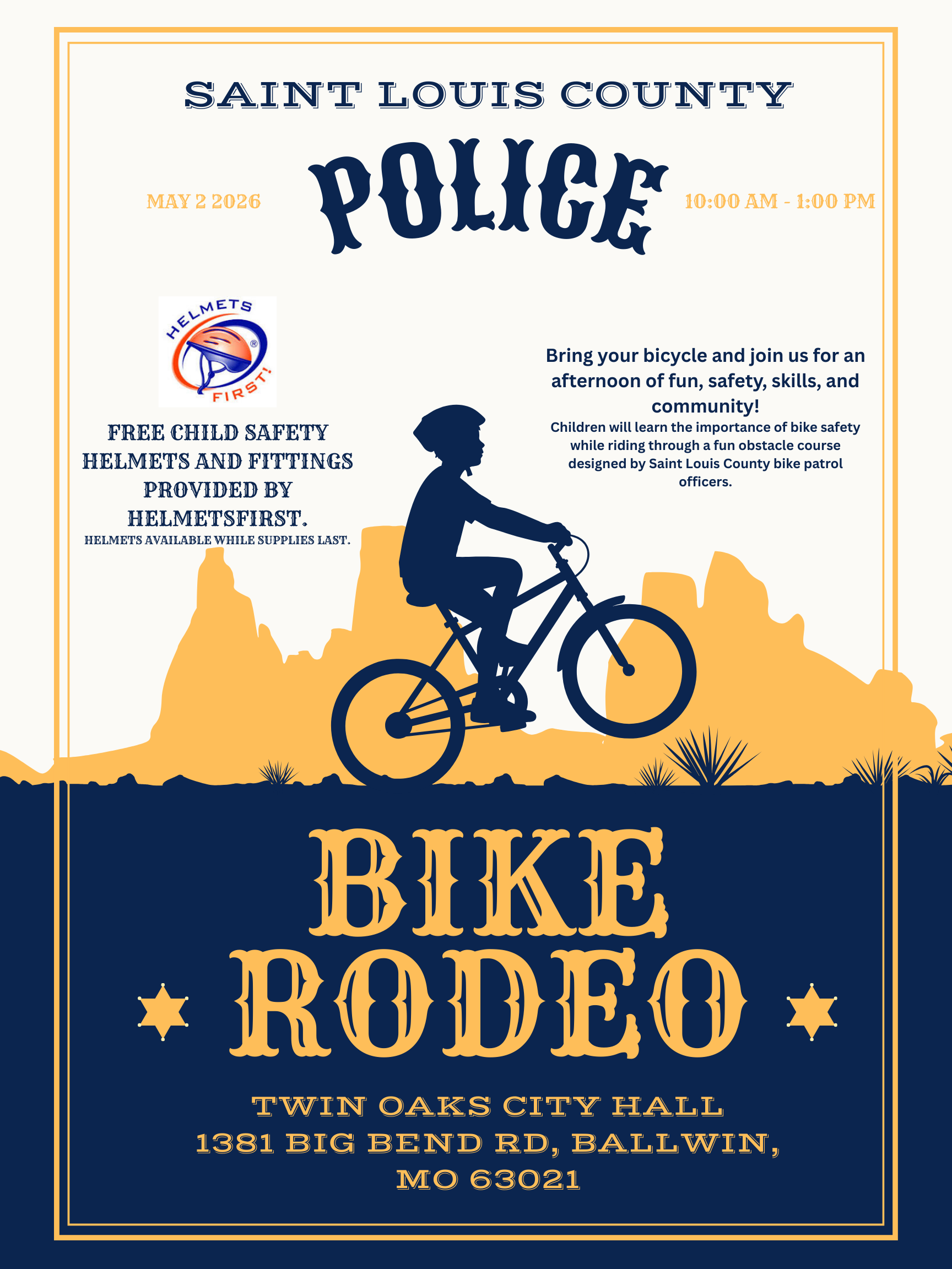 Bring your bicycle and join officers from the St. Louis County Police Department for a day of fun, safety, skills and community! Children will learn the importance of bike safety while riding through a fun obstacle course designed by St. Louis County bike patrol officers. Free child safety helmets and fittings provided by Helmets First while supplies last.