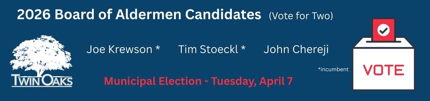 Make plans to vote in the upcoming Municipal Election! Per the St. Louis County Board of Elections, Twin Oaks City Hall will not serve as a polling place for the 2026 Municipal Election. The closest polling place is the Grand Glaize Branch of the St. Louis County Library at 1010 Meramec Station Road. No excuse, in-person absentee voting begins at this location on Tuesday, March 31. For more information about voting in the April 7th Municipal Election, visit the St. Louis County Board of Elections website.