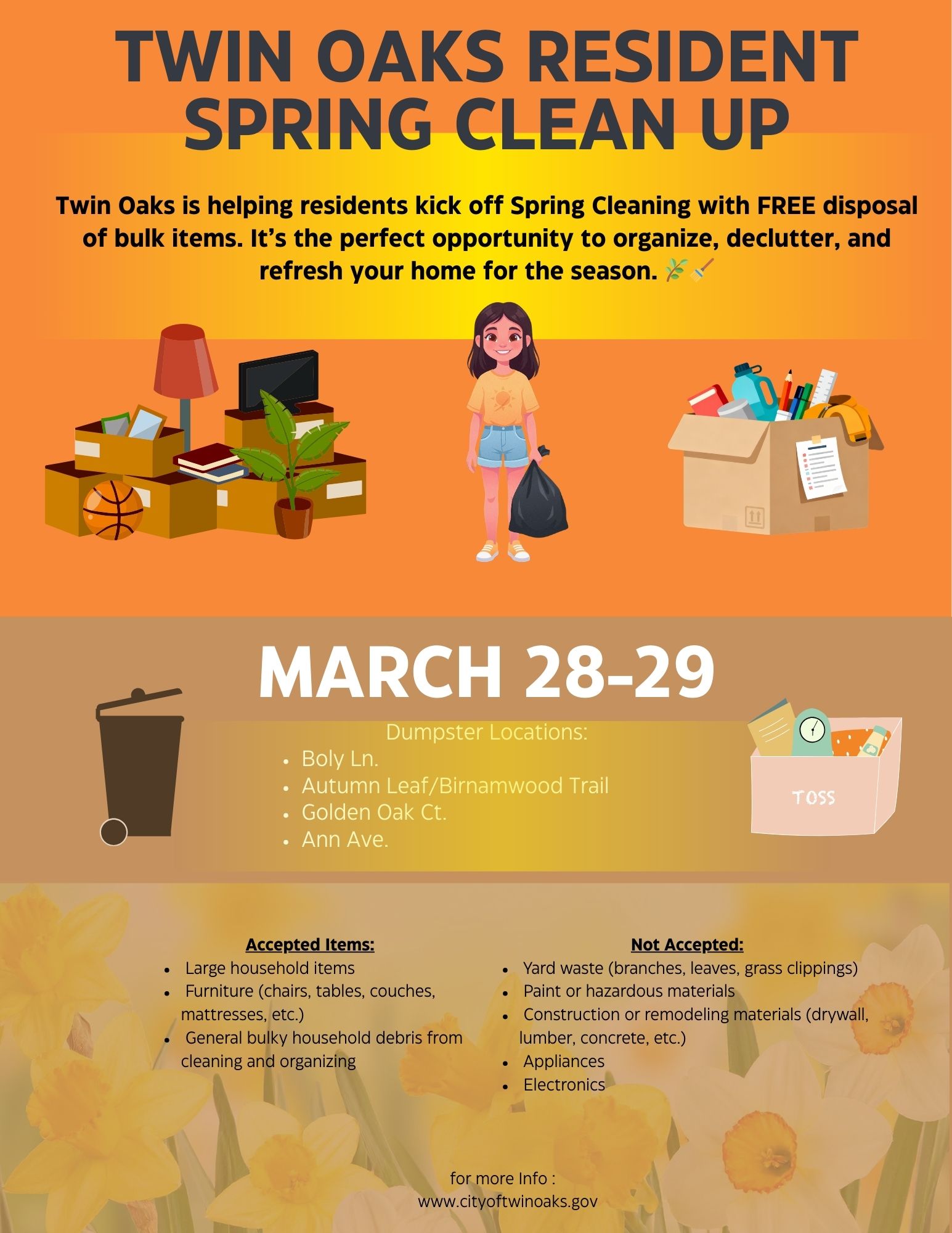 For your convenience, the City has scheduled a Spring Clean Out Weekend on March 28-29. Dumpsters will be available in the neighborhoods for residents to deposit bulky trash items and other household waste - think old furniture, accumulated junk, etc. Just haul it to a nearby dumpster for free removal. Dumpsters will be delivered to locations on the streets of Ann Avenue, Boly Lane, Golden Oak Court and the intersection of Birnamwood Trail/Autumn Leaf Drive. Please note the following items will not be accepted - electronics of any kind, appliances, and paint or other liquids. All items must be below the top of the dumpster; no mounding permitted.