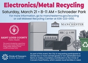 Our friends at the City of Manchester are hosting an Electronics & Metal Recycling Event on Saturday, March 21, from 8–11 a.m. at Schroeder Park. Arrive early to ensure your items can be dropped off. For accepted items and details, visit manchestermo.gov/ecycling or call Midwest Recycling Center at 636-223-0150. Please also bring a couple of canned goods or non-perishable food items to support Circle of Concern Food Pantry.